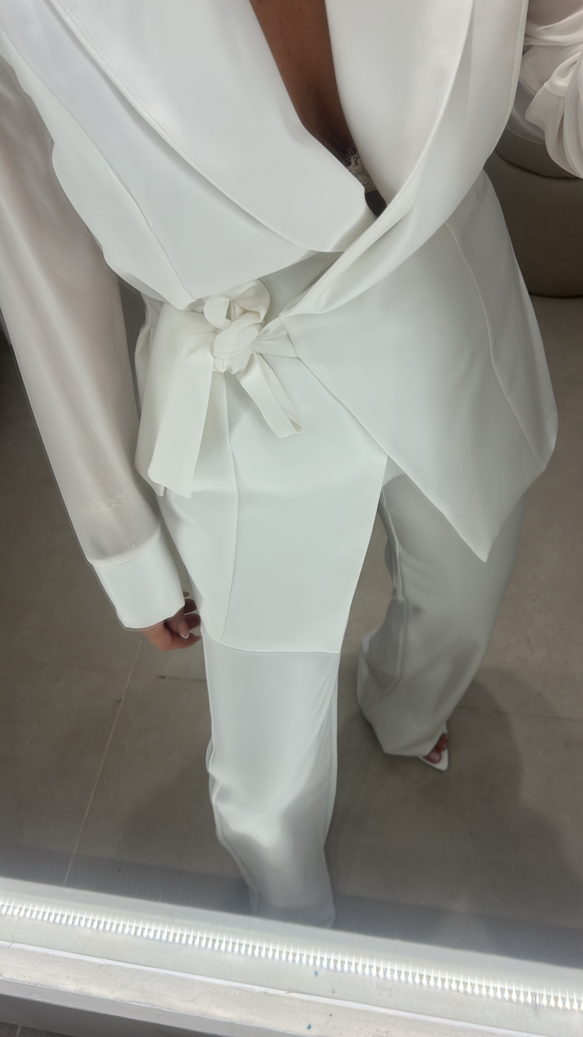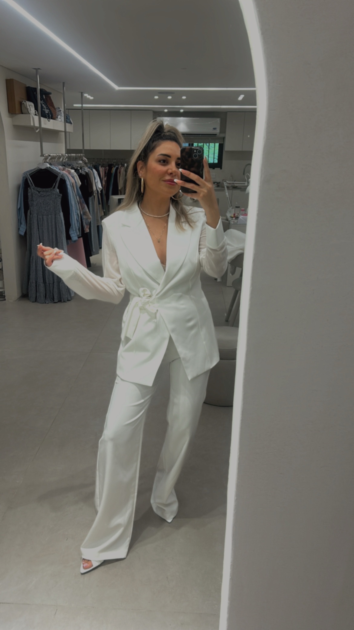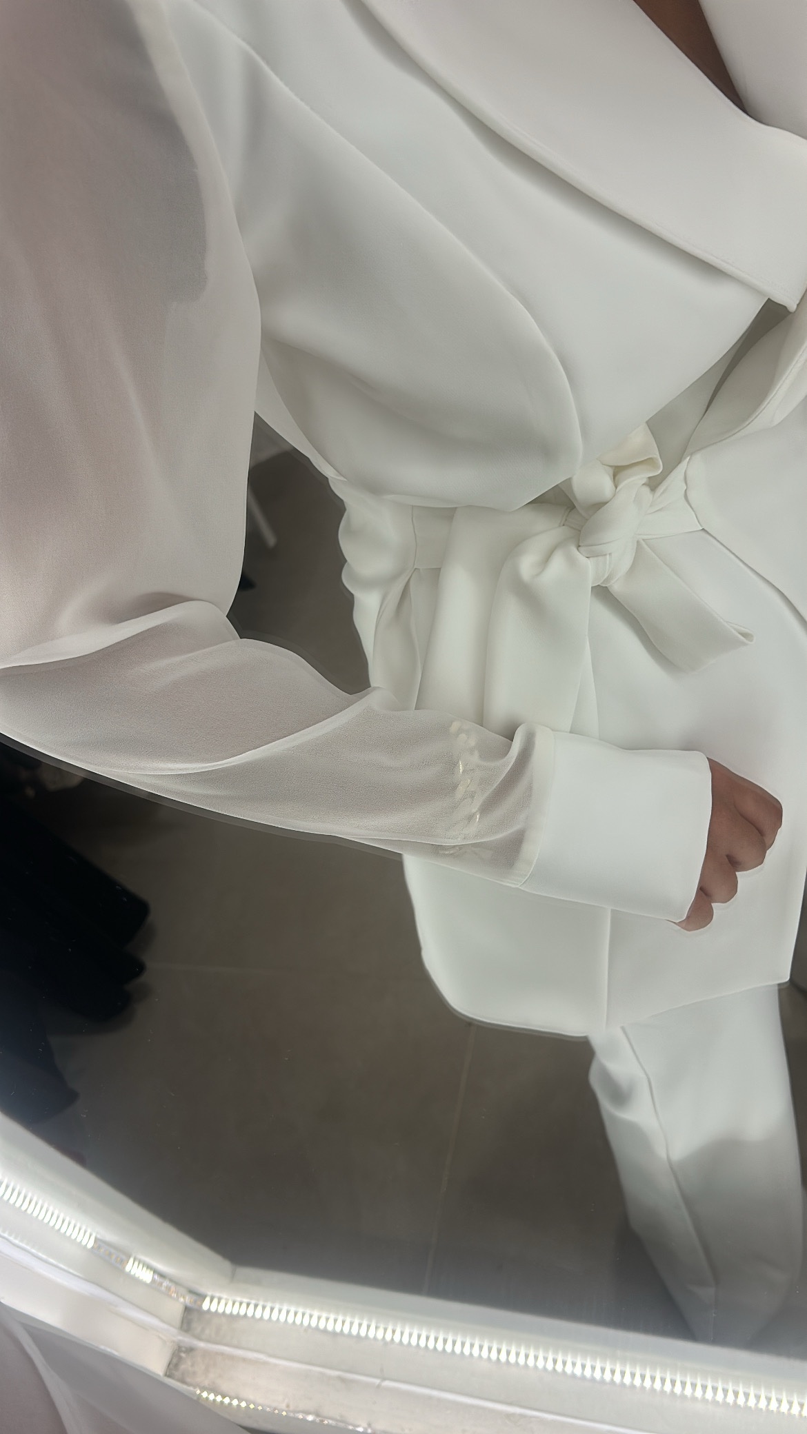 חליפת בלייזר מעטפה, גזרה מחמיאה ,שרוול שיפון שקוף, מכנס גומי עם לייקרה